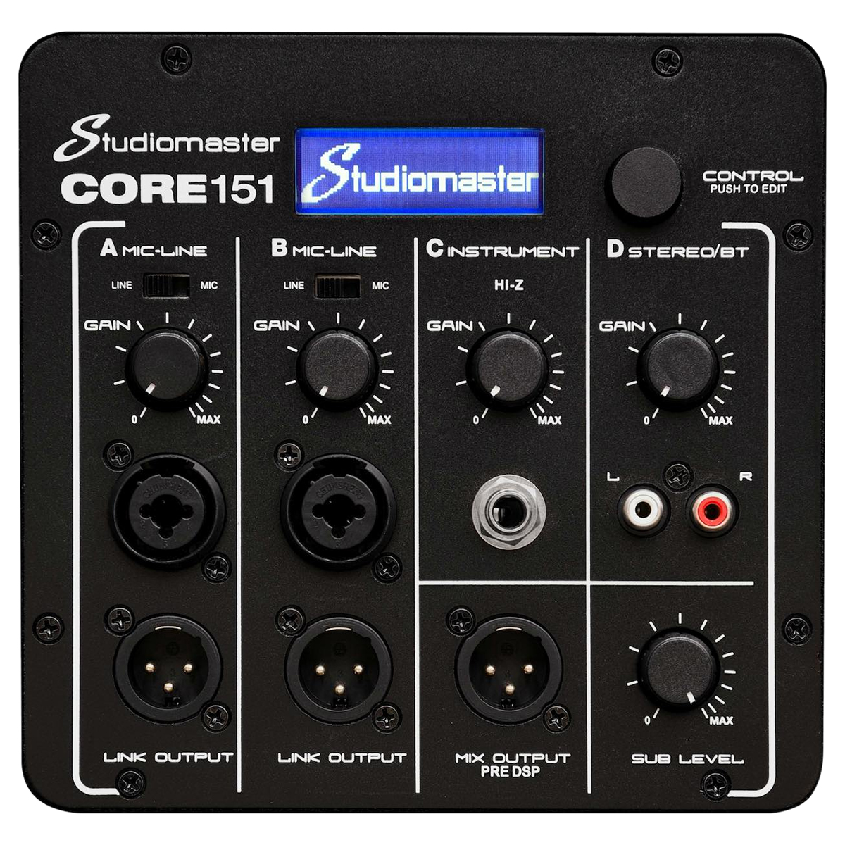 Mezcla de 4 canales con 2 mic/line, un instrumento Hi-Z y una entrada stereo line / bluetooth para brindarte la capacidad de conectar tu equipo sin un escritorio separado. Un subnivel dedicado para lograr la mezcla perfecta y una seleccin de salidas de enlace segn tus requerimientos. El procesamiento disponible es todo a travs de una interfaz DSP simple con una pantalla LCD retro iluminada y un solo control. Elije un preajuste DJ, MUSIC o VOCAL y ten acceso a ecualizador de tres bandas, salida de delay, volumen master y medicin til de todos los canales.
