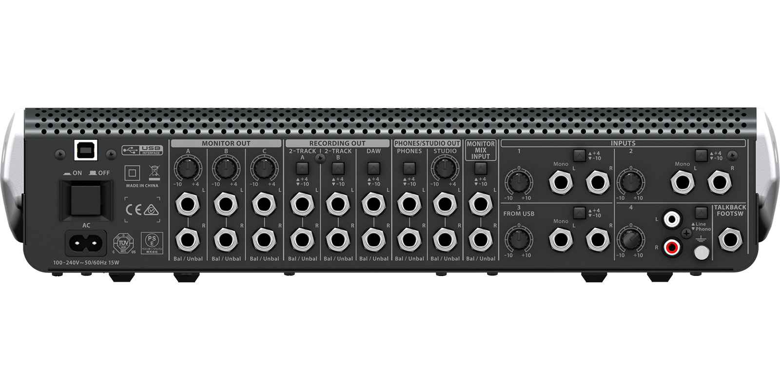 Unidad de ganancia con entrada 1, 2 y 3 asignadas: -86 dBu, 20 Hz a 20 kHz.Salidas de monitor A, B y C, DAW, salidas A y B de 2 track: -90 dBu, 20 Hz a 20 kHz.Entrada phono: -75 dBu, 20 Hz a 20 kHz.Nivel de ruido equivalente (E.I.N.): -119 dBu, 20 Hz a 20 kHz.