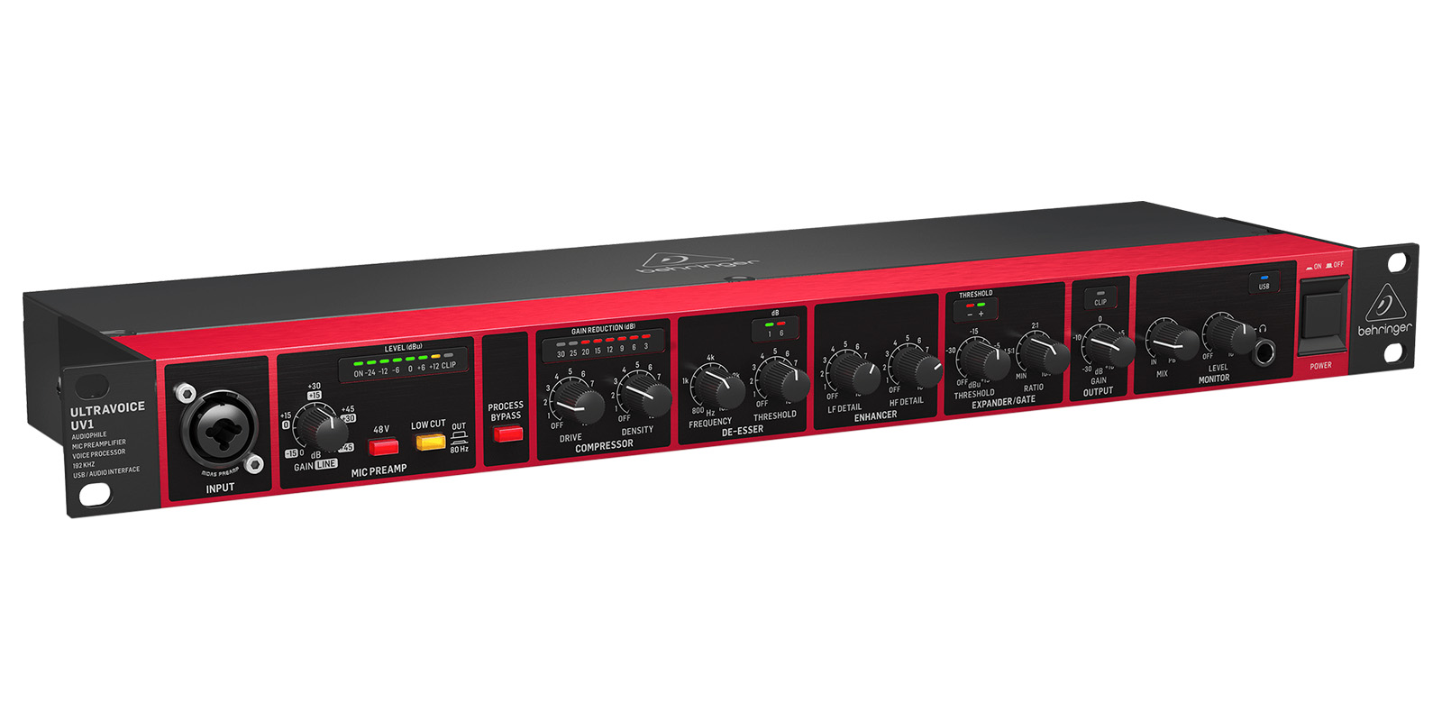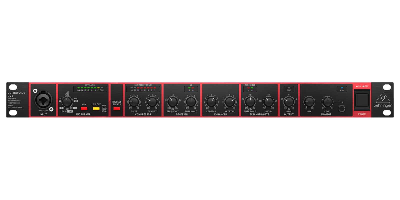 Mic preamp:Ganancia: Mic: 0 a +60 dB, line: -15 a +45 dB.48 V: +48 V alimentacin phantom, conmutable.Low cut: -18 dB/oct @ 80 Hz.Compresor:Drive: Threshold, -40 dB a +20 dB.Densidad: 1 a 75 dB/sec.De-Esser:Frecuencia: 800 Hz a 10 kHz.Threshold: Dependiente del programa.Release time: Dependiente del programa, aprox. 1 ms/dB.Potenciador:Detalle de LF/HF: Boost min a mx (0 dB a +12 dB).Expander/Gate.Threshold: Off a +15 dB.Relacin: 1:1 a 10:1.Salida:Ganancia de salida: -30 a +10 dB.Monitor:Mezcla: Combina seal directa y reproduccin.Nivel: -8 a +6 dB.